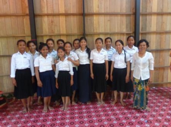 13 of the MountainGirls in their new bedroom with the lady Leng has employed to sleep with them each night for security. Sophan the ODA Schools Manager and his wife are also at the bottom of their stairs.